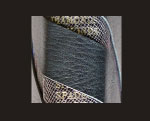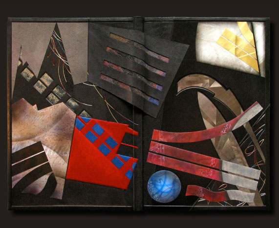 Bound in 2009 in dark brown goatskin with applications of goatskin, wood veneer, laminated mylar, painted aluminum and brass, painted cotton gauze, gold and painted tooling. Title in gold on spine (behind gauze.)