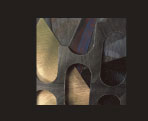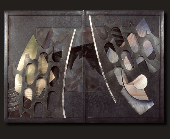 John McPhee et al. Cheloniidae Press, Easthampton, MA, 1981. 12”x 8 3/4” page size. Etching and wood engravings by Alan James Robinson. Bound in 2006 in gray goatskin with applications of laminated mylar, aluminum, brass and acrylic paint.