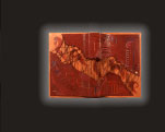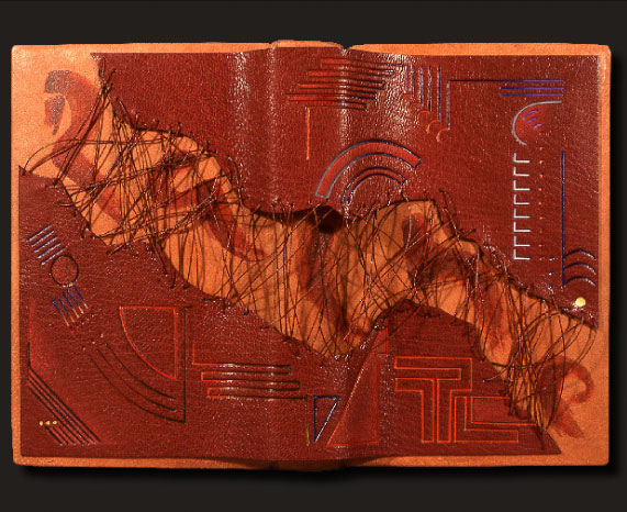 17 1/8”x4 5/8” page size. Bound in 2001 in terra cotta goatskin with burgandy goatskin overbinding, linen thread, gold and painted tooling and acrylic paint.