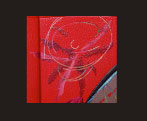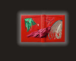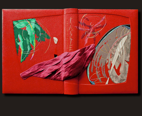 Brillat-Savarin. Translation by M.F.K. Fisher. Arion Press, San Francisco, 1994. Lithographs by Wayne Theibaud. 13 3/4”x10 1/4” page size. Bound in 2010 in red goatskin with onlays of goatskin, snakeskin, aluminum, laminated mylar and linen napkin. Gold and painted tooling. Title in gold and painted tooling on spine.