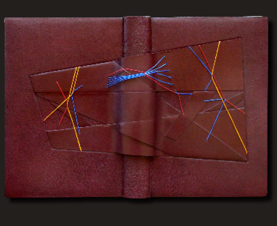Pamela Train Leutz. Oak Knoll Press, New Castle, DE, 2010. 9”x6” page size. Bound in 2011 in burgundy goatskin with burgundy overbinding and painted linen thread.